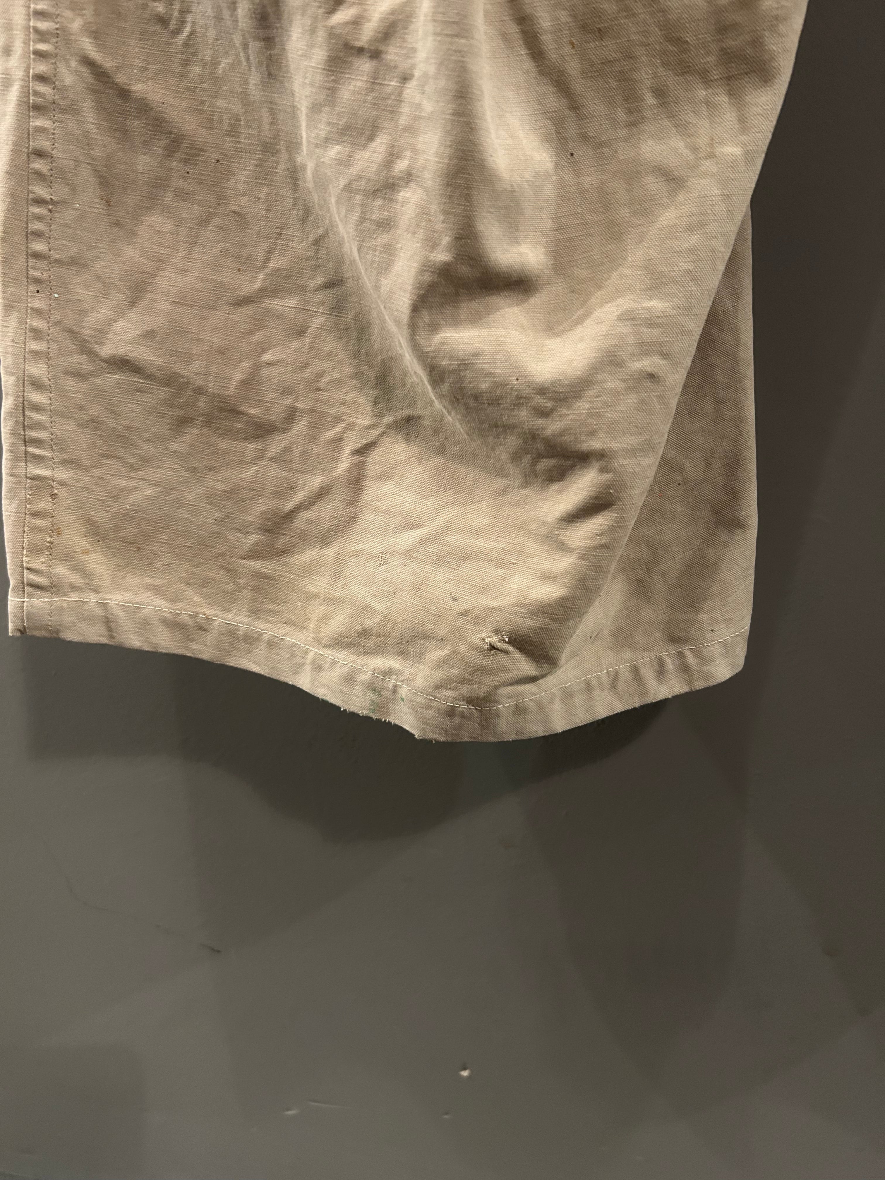 平織りのコットンでしっかりした生地。膝下には当て布で補修があったり、襟元、袖口などダメージはありますがペイントのおかげでいい雰囲気になっていますね。