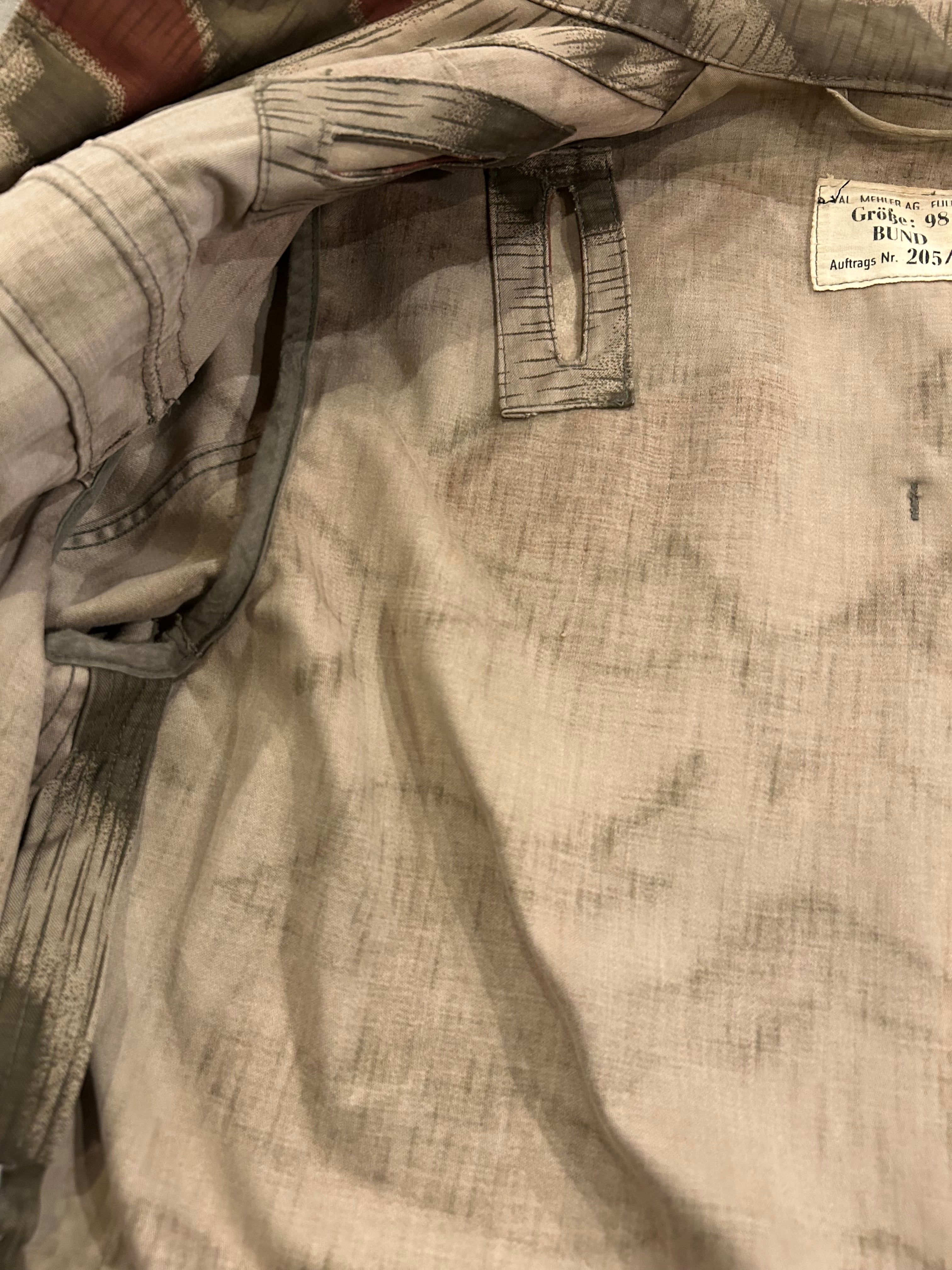 細かいディテールも面白いものが多く、ドイツ軍独特の反射防止のボタンや、背面の通気孔、雑のうを下げていたDリングなど、満載です。アメリカ軍のm65フィールドジャケットの様なテンションで、ブルゾン感覚で羽織るだけで個性の出るアイテムですのでおすすめです。Dカンが片方欠損しておりますが、色味はしっかりと残っている個体です。お探しの方は是非手に取ってみてください。