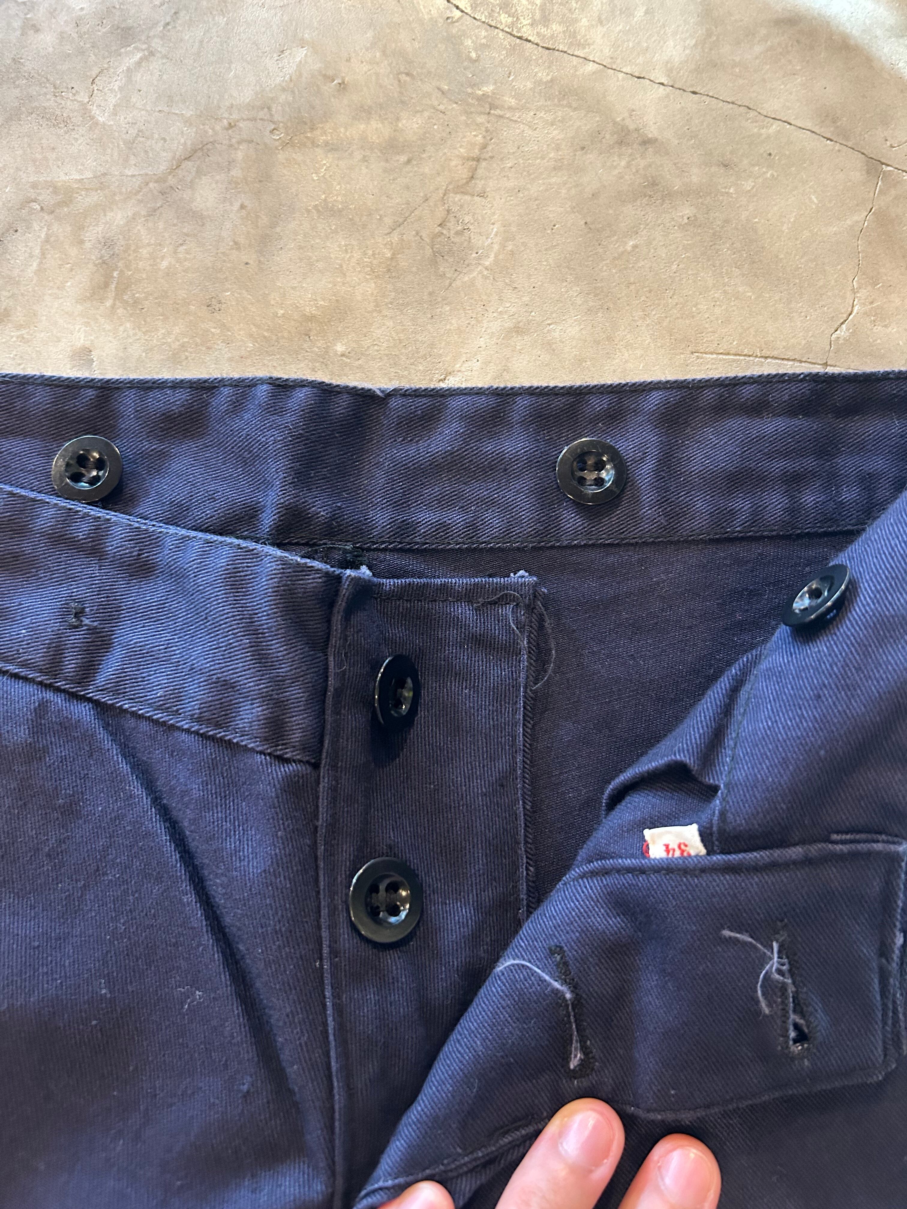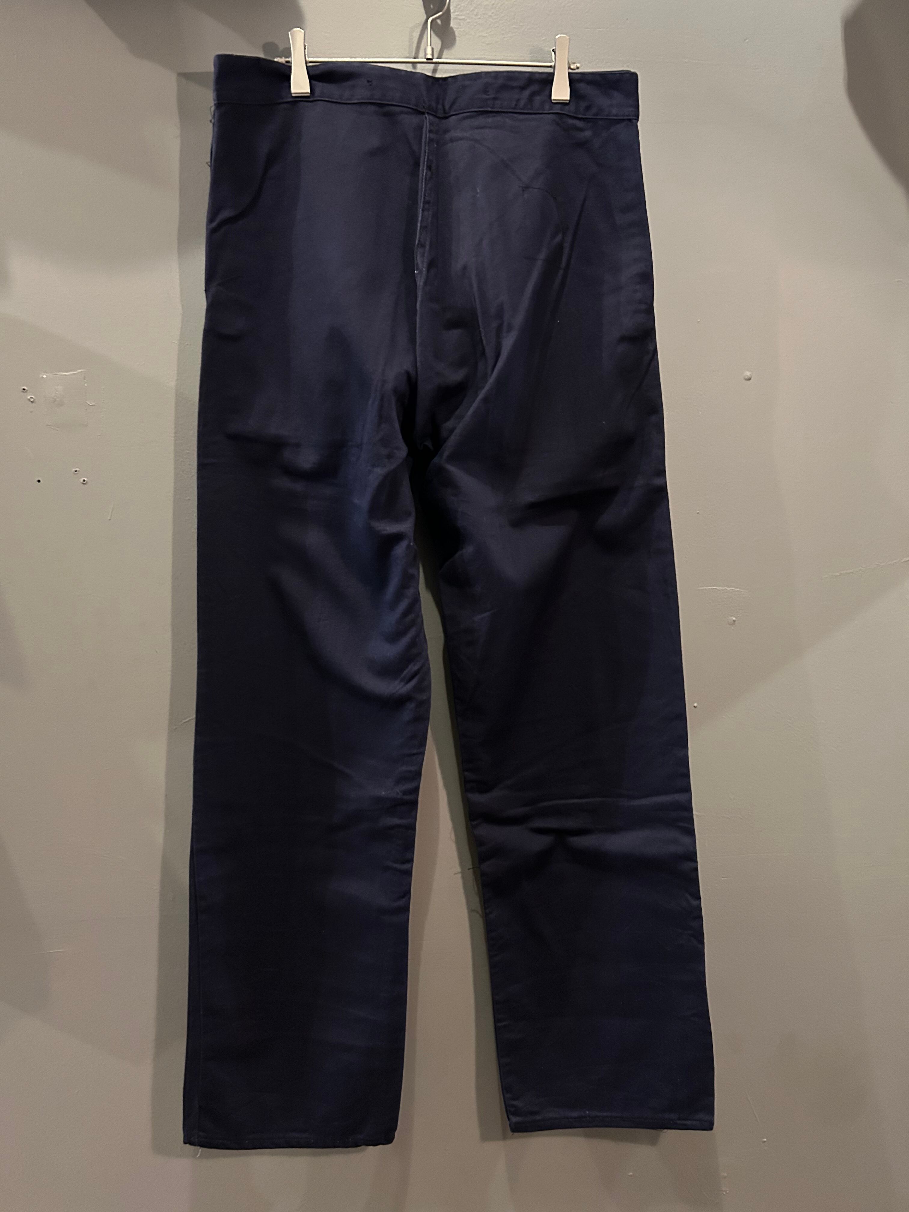 イギリスのワークパンツのご紹介です。タグは取れてしまってますが、おそらくイギリスの国鉄などで使われていたワークパンツかと思います。イギリスらしい紫がかったネイビーカラーに、テーパードのかかった綺麗なシルエット、どんなスタイリングにも落とし込みやすい万能なアイテムです。雰囲気はイギリス軍のワーキングドレスパンツに似てますね。