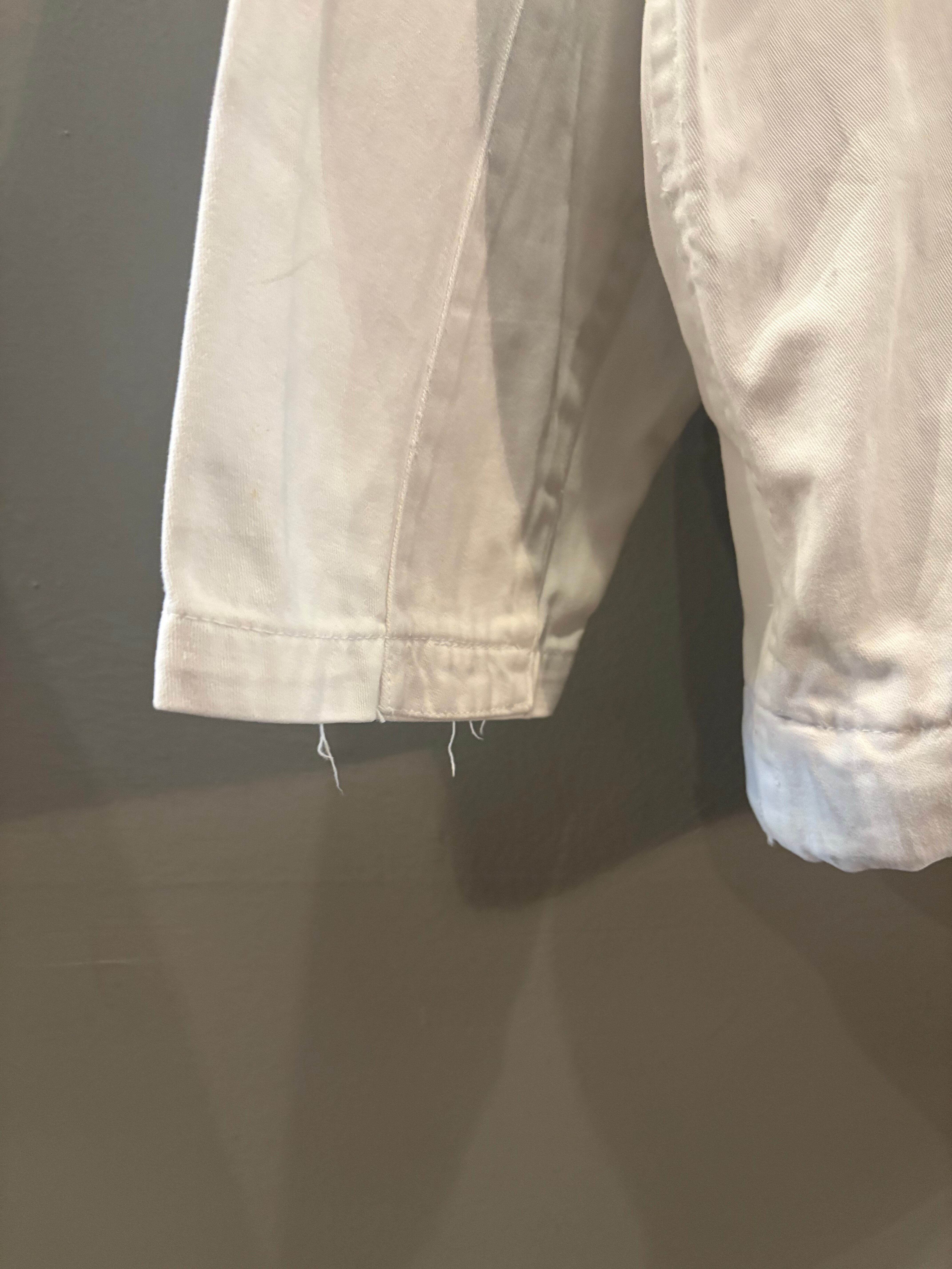 まっさらなオフホワイトカラーにミリタリーらしさを感じさせる4つポケットのディテール、デザイナーズの様な存在感がありますね。他のSASアイテムに比べ地厚な生地感が重量感を醸し出し、クリーンな色に対しての深みのあるアイテムです。存在感こそあるもののオフホワイトでスタイリングに落とし込みやすく、タフな生地感でデイリーに使いやすいです。