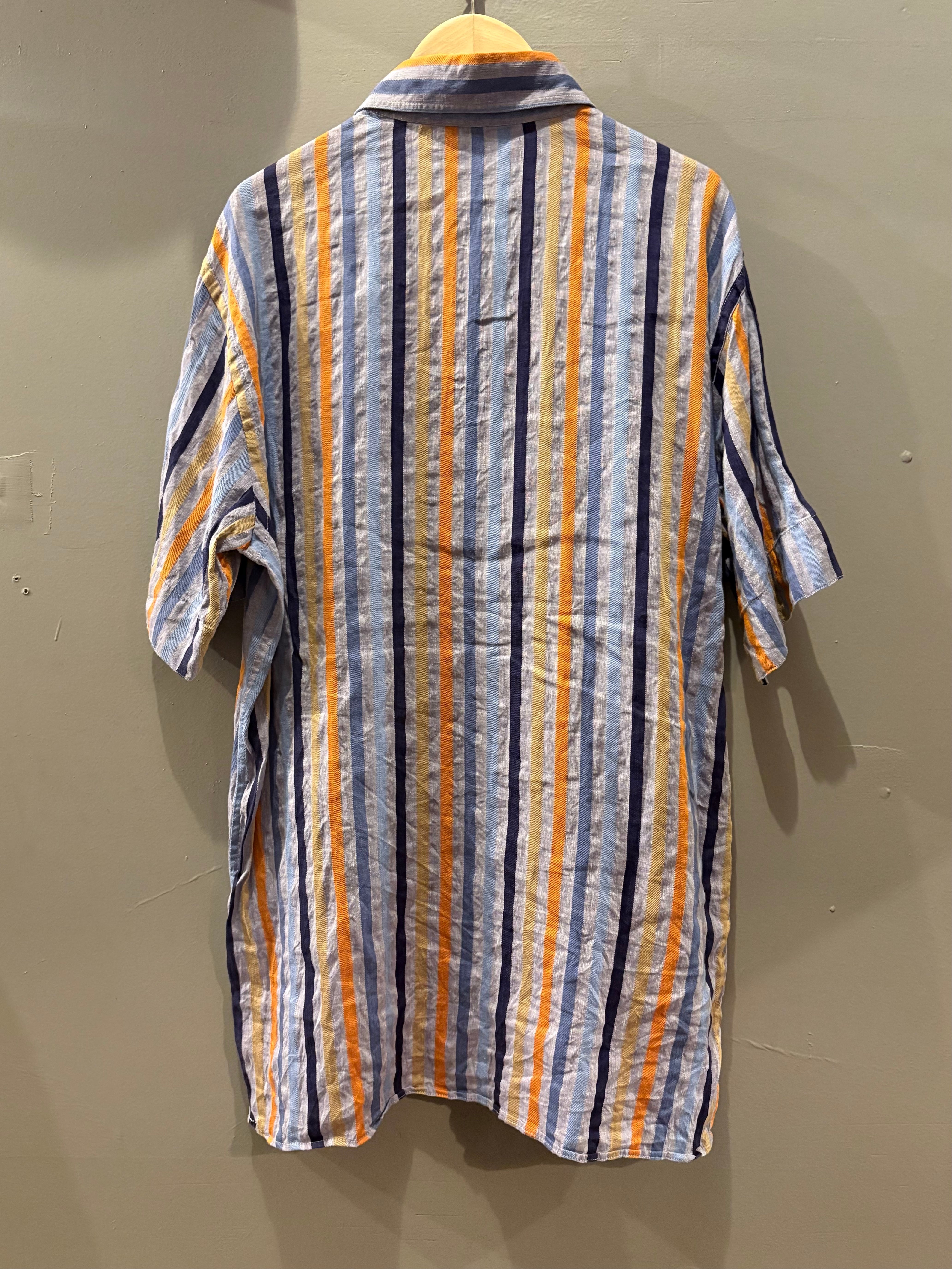こちらのシャツはコットン30%リネン70%の混紡生地で、リネンらしいハリとコットンの柔らかい風合いが肌馴染みの良い1着です。配色や柄はイタリアらしく、太めピッチのカラフルなストライプ柄でポップな印象を与えつつカジュアルになりすぎないバランスが、大人っぽいスタイリングにもハマりますね。無難にチノトラウザーやショーツと合わせて、足元はローファーなどで引き締めるのがおすすめです。