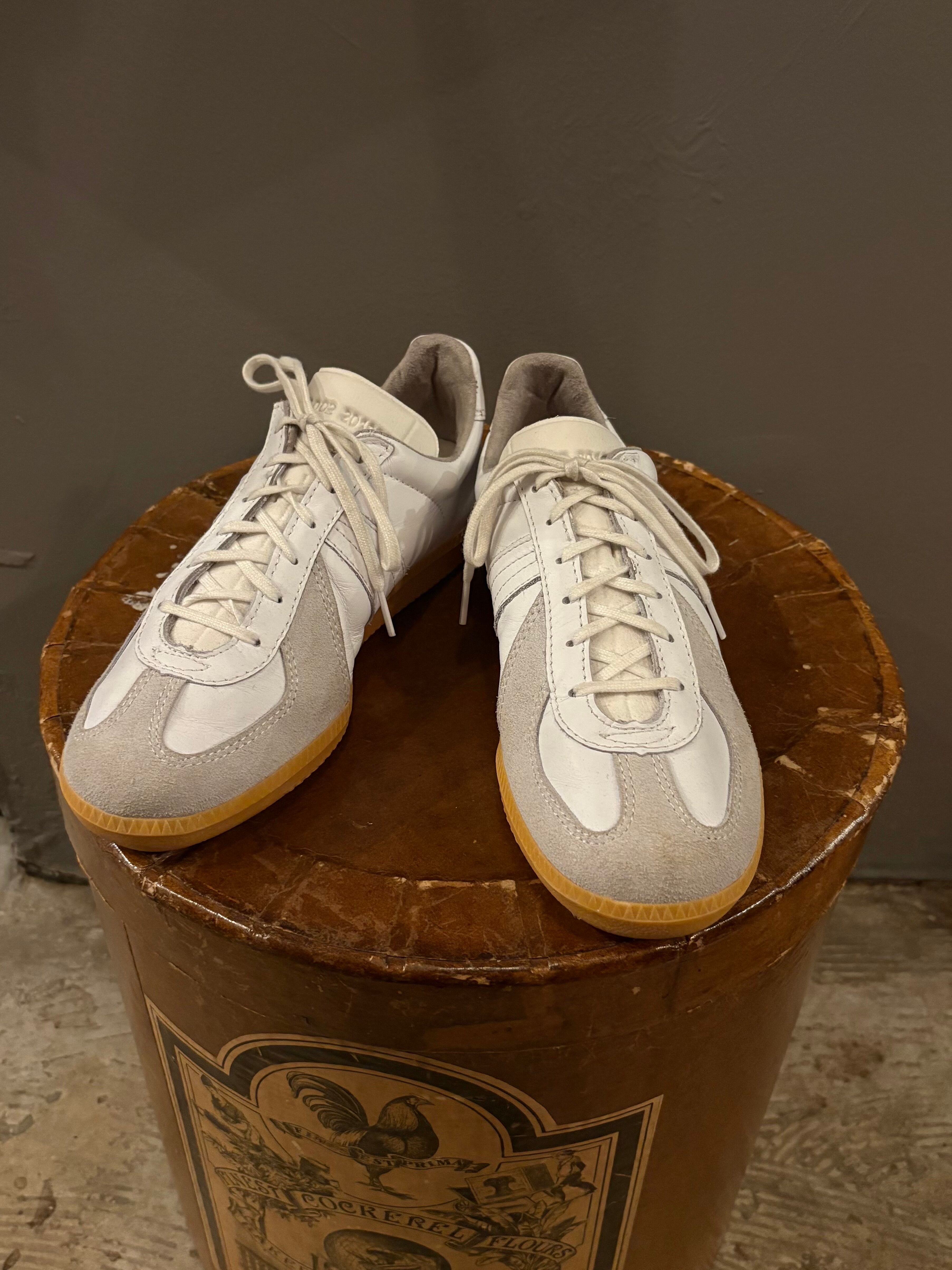 ジャーマントレーナーといえば様々なブランドがサンプリングしたり、リプロダクトされていることでも有名ですが、この無駄のないディテールが洗練された雰囲気を醸し出しますね。耐久性を考えてベースのレザーに対してつま先をスエードに切り替えてますが、それが故にデザインとして格好いいシューズです。このガムソールもジャーマントレーナーの特徴で、上品さの中にどこかチープな印象が目受けられます。