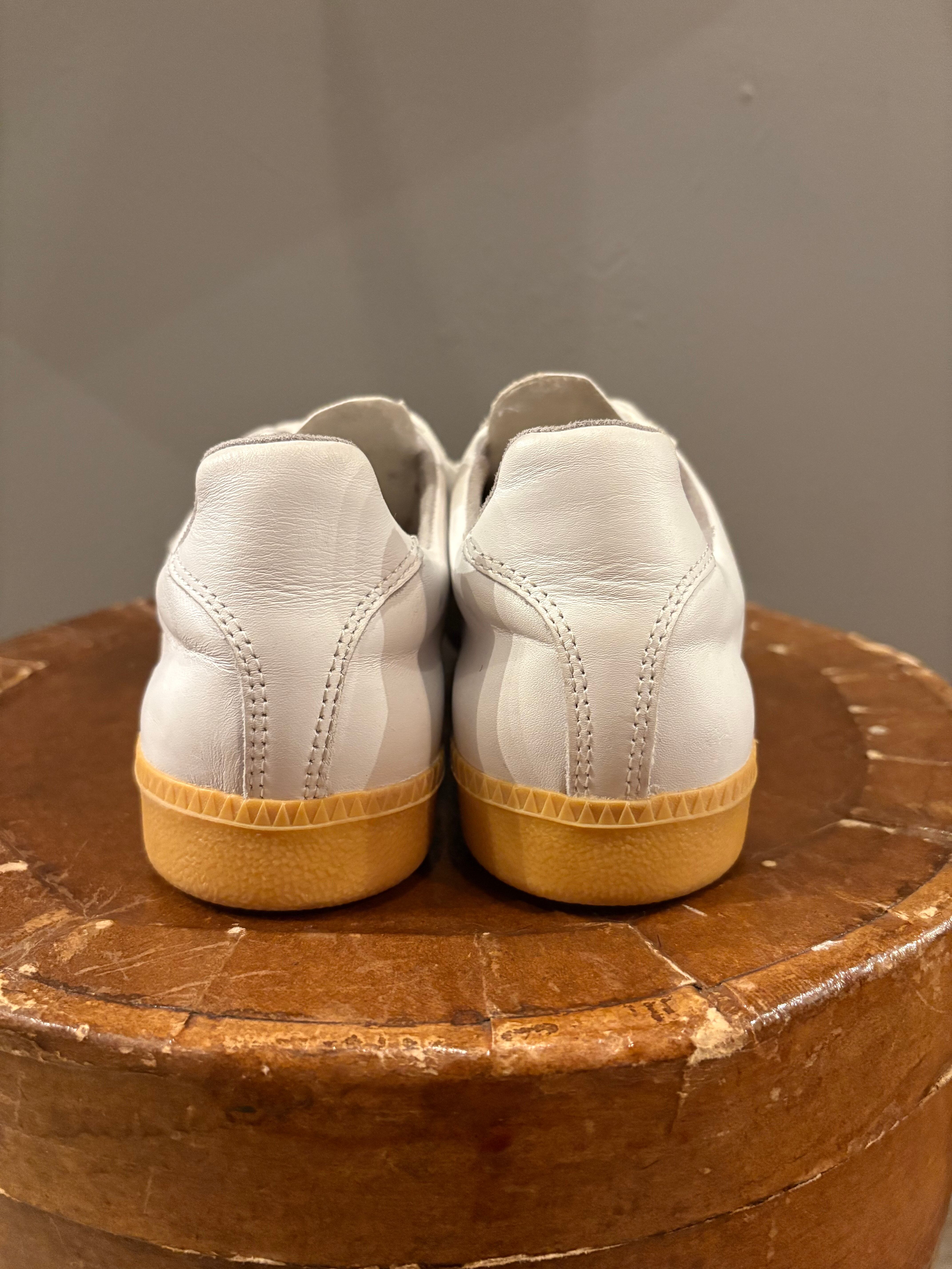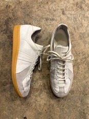 ジャーマントレーナーといえば様々なブランドがサンプリングしたり、リプロダクトされていることでも有名ですが、この無駄のないディテールが洗練された雰囲気を醸し出しますね。耐久性を考えてベースのレザーに対してつま先をスエードに切り替えてますが、それが故にデザインとして格好いいシューズです。このガムソールもジャーマントレーナーの特徴で、上品さの中にどこかチープな印象が目受けられます。