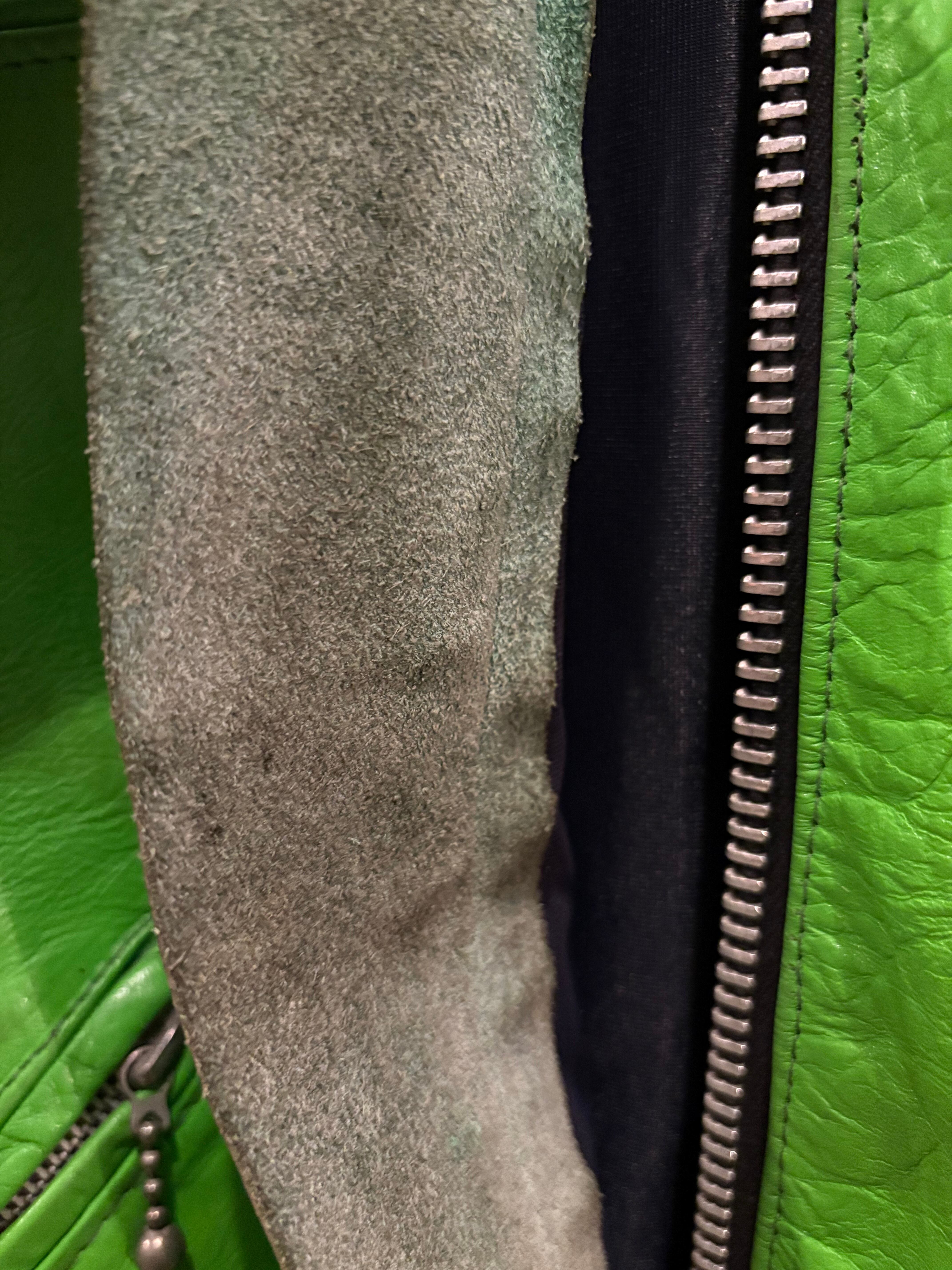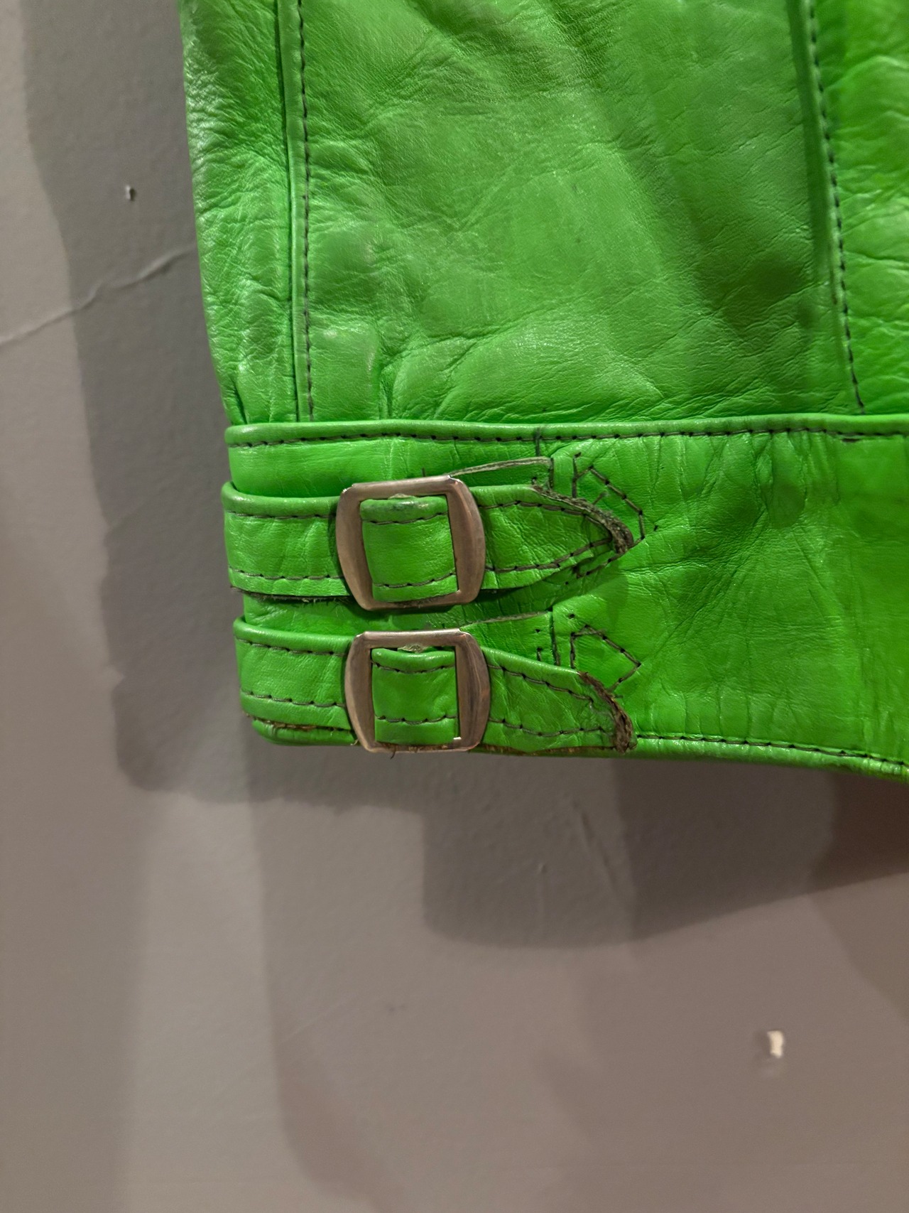 ルイスレザーの黄金期とも言われる70年代、目を惹くライムグリーンが特徴のKAWASAKIカラー。こちらのモデルはスーパースポーツマンと言われるモデルです。1975年から登場し、元々存在しているスポーツマンというモデルにウエストバンドの追加、サイドバックルもツインとなり、より英国らしさを感じられるようなデザインに変わっていきました。旧モデルに比べて着丈も長めに設定され、シングルブレストもシンプルかつスタイリッシュでライダースの中でも着やすい形ではないでしょうか。