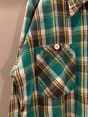 配色がとてもいいですね。ヘビーネルシャツの起毛した雰囲気にエメラルドグリーンのパキッとしたチェック柄がポップな印象にしてくれます。ラウンドカットの裾はシャツをインせずにレイヤードしても良さそうです。