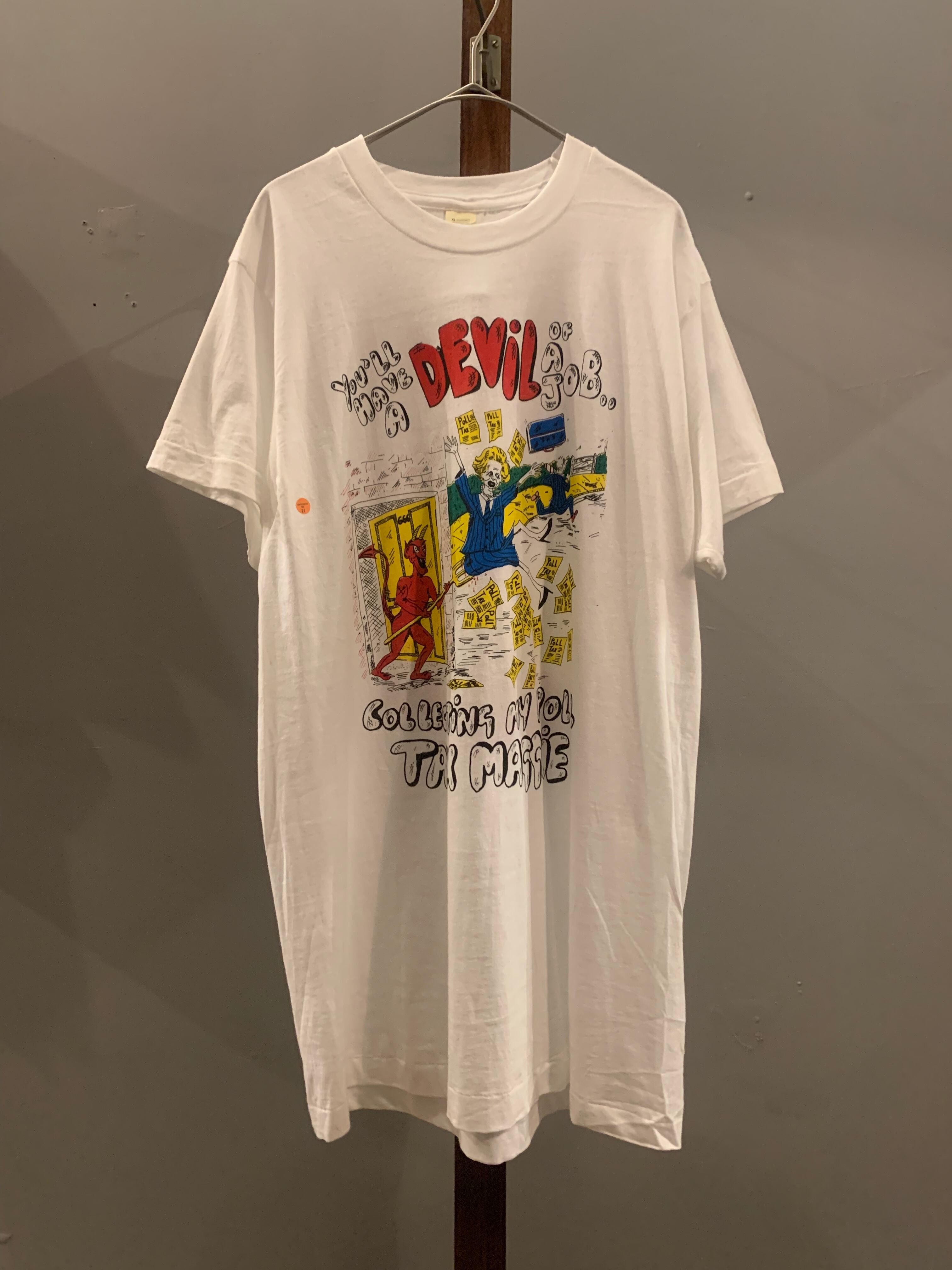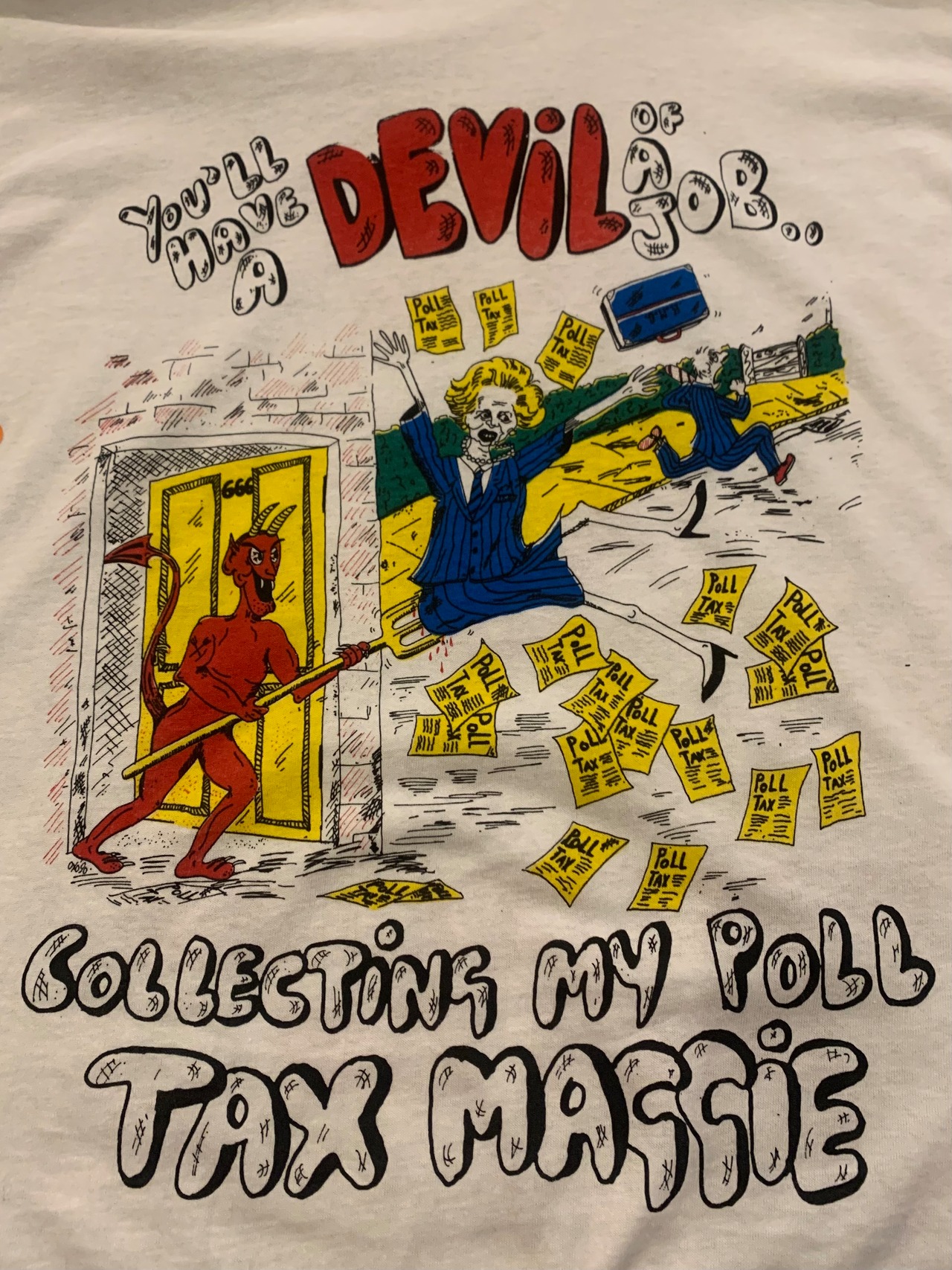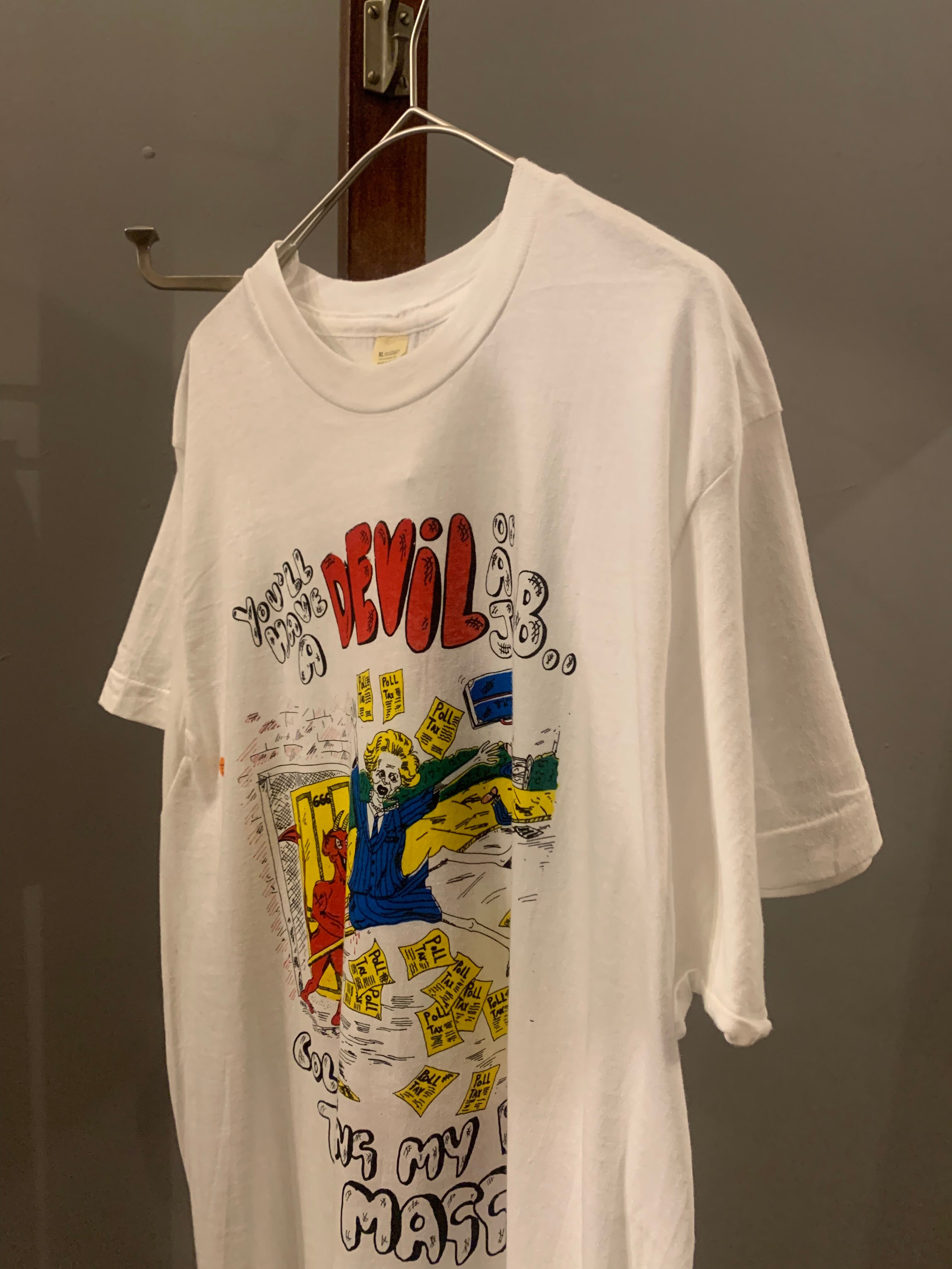 1990年代頃にイギリスで導入された人頭税。富裕者に有利なこの税制度に対し、国民の反感を買った背景がキャッチーなイラストで描かれています。ポップでカラフルなデザインは、フットボールTシャツとしてはもちろん、雰囲気のいいプリントTシャツとしてもおすすめです。
