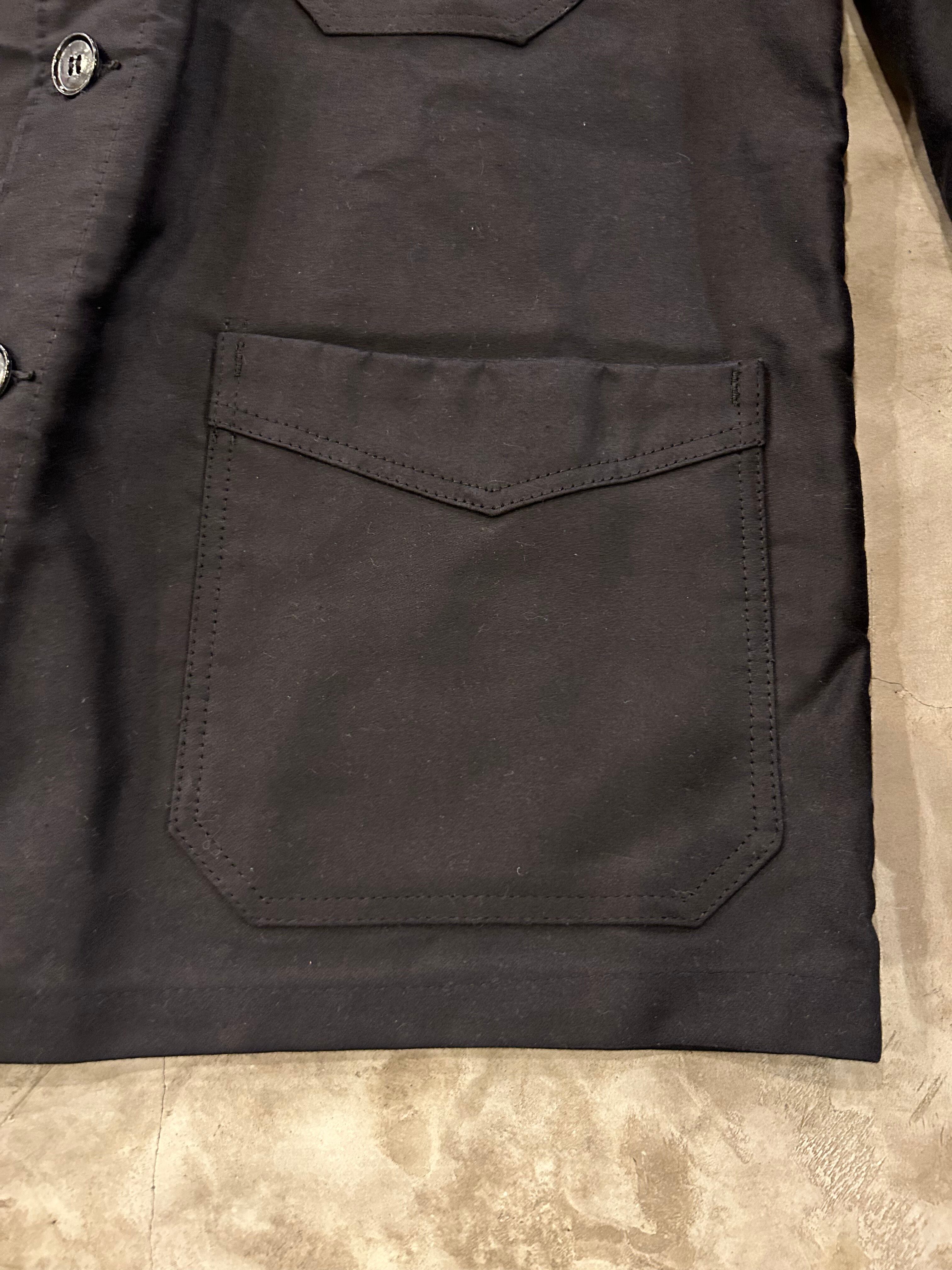 特に人気の高いブラックモールスキンです。デッドストックですので、これから経年変化が楽しめる個体です。またフレンチワーク特有の丸くラウンドした襟も健在で、胸のポケットやフロントポケットのVステッチ、Aラインのシルエットがワークジャケットとは思えないほど魅力的な一着です。