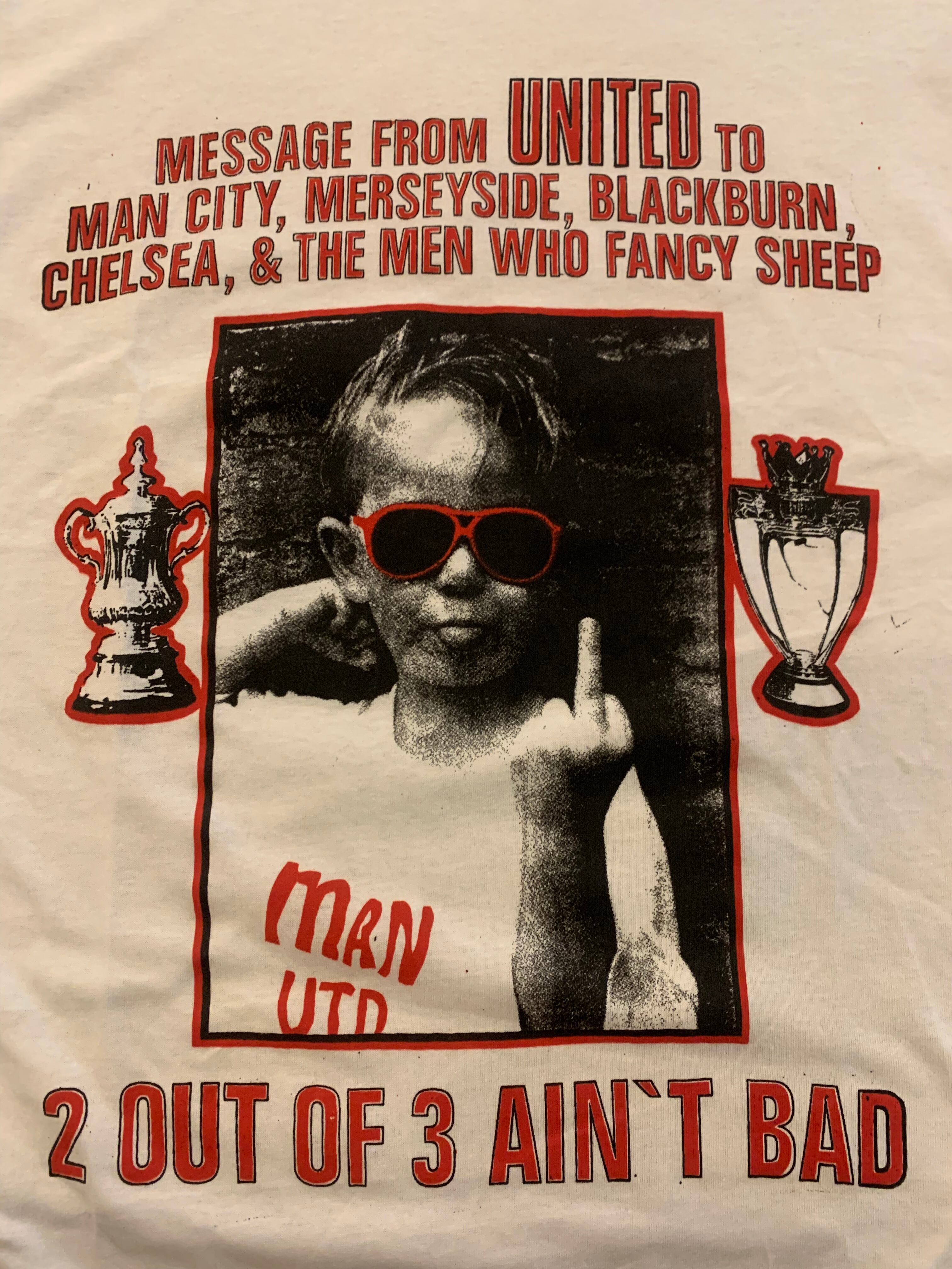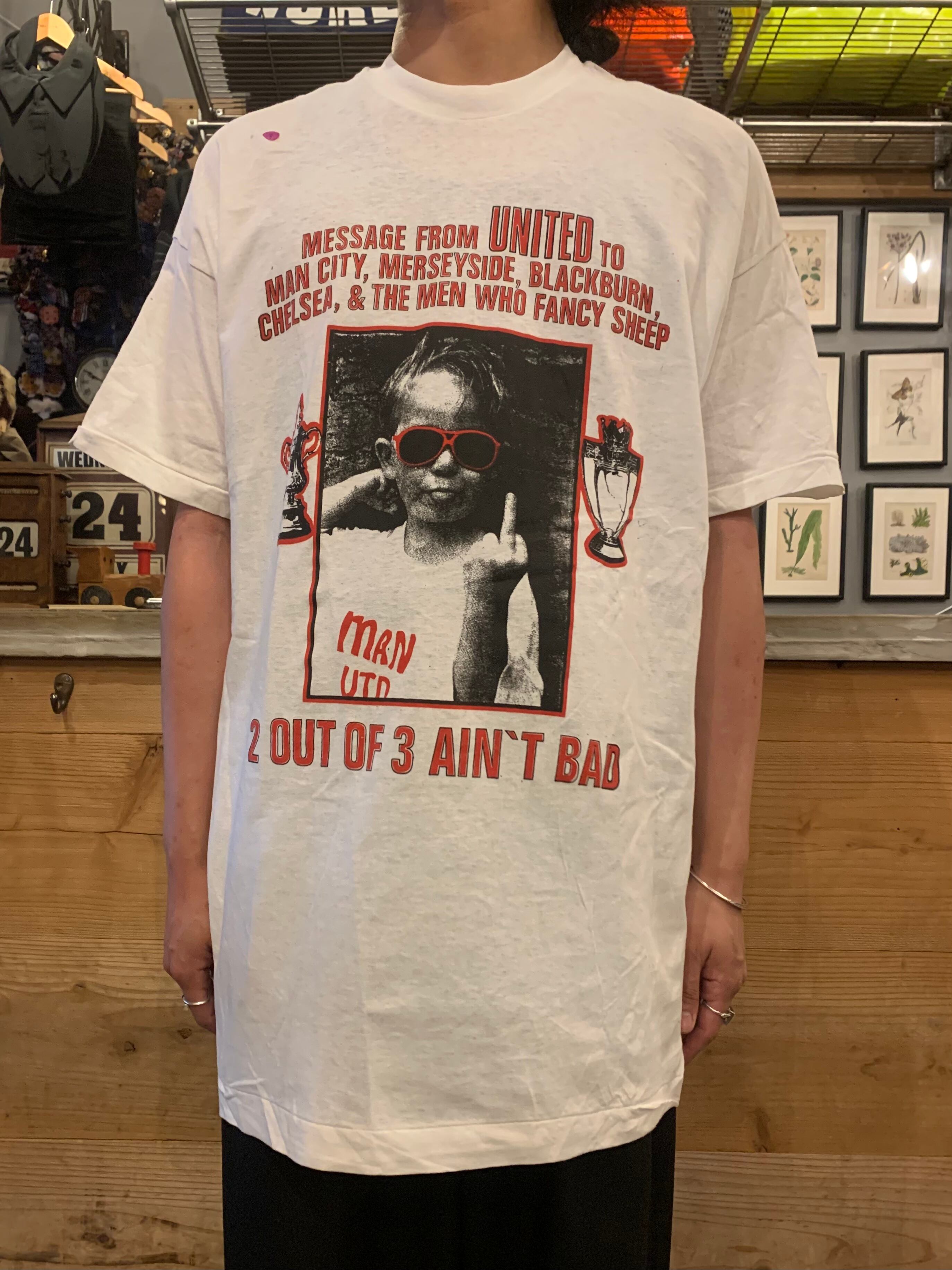 こちらは1995/96年のマンチェスターユナイテッドの優勝シーズンを祝うメッセージが込められたプリントTシャツです。インパクトのあるモノクロ写真に赤文字のバランスが目を惹くデザイン。英文字の意味はおそらく、マンチェスターユナイテッドから他チームに向けた挑戦的なメッセージとも見て取れます。解釈が色々できて面白いですね。