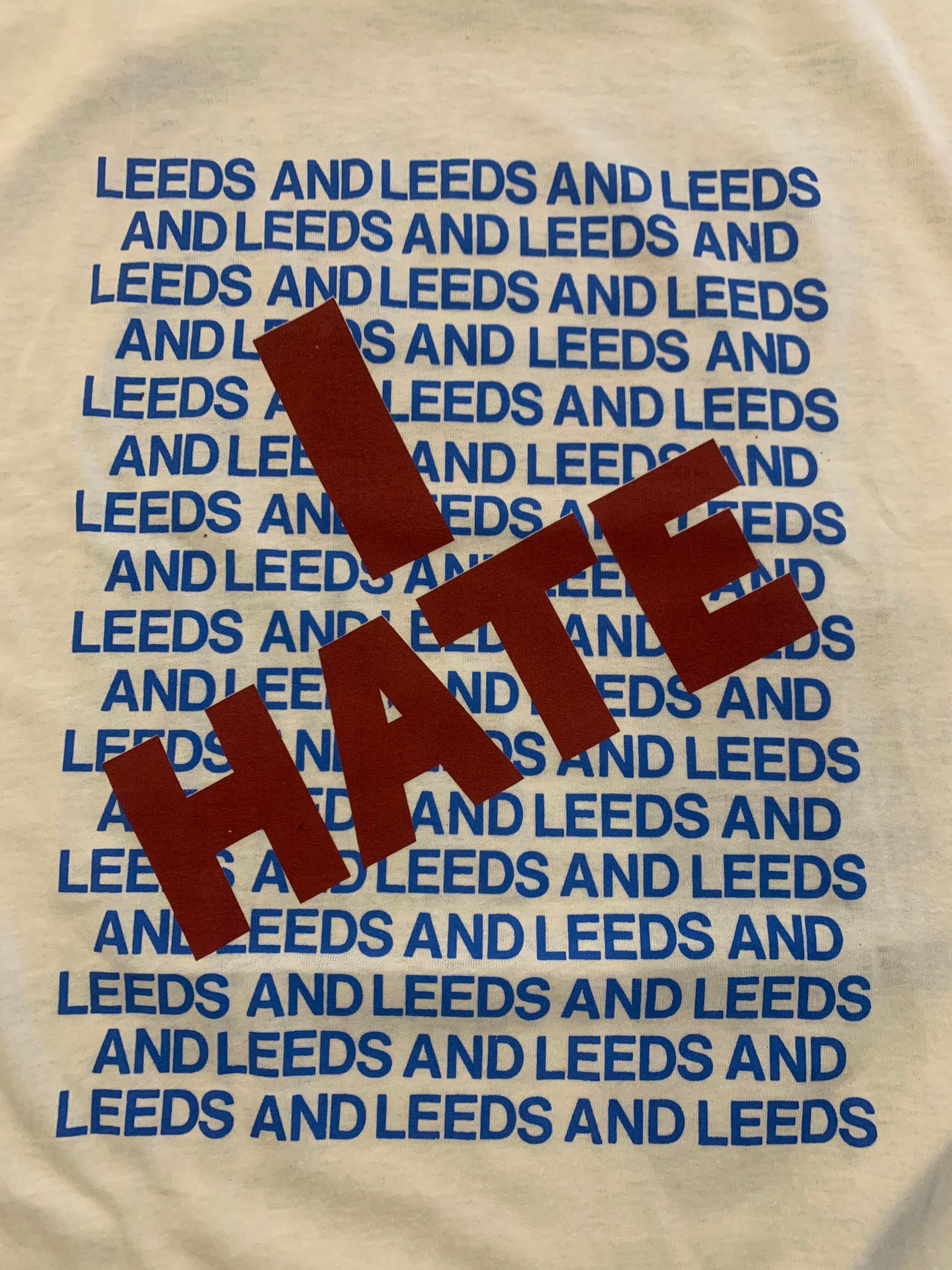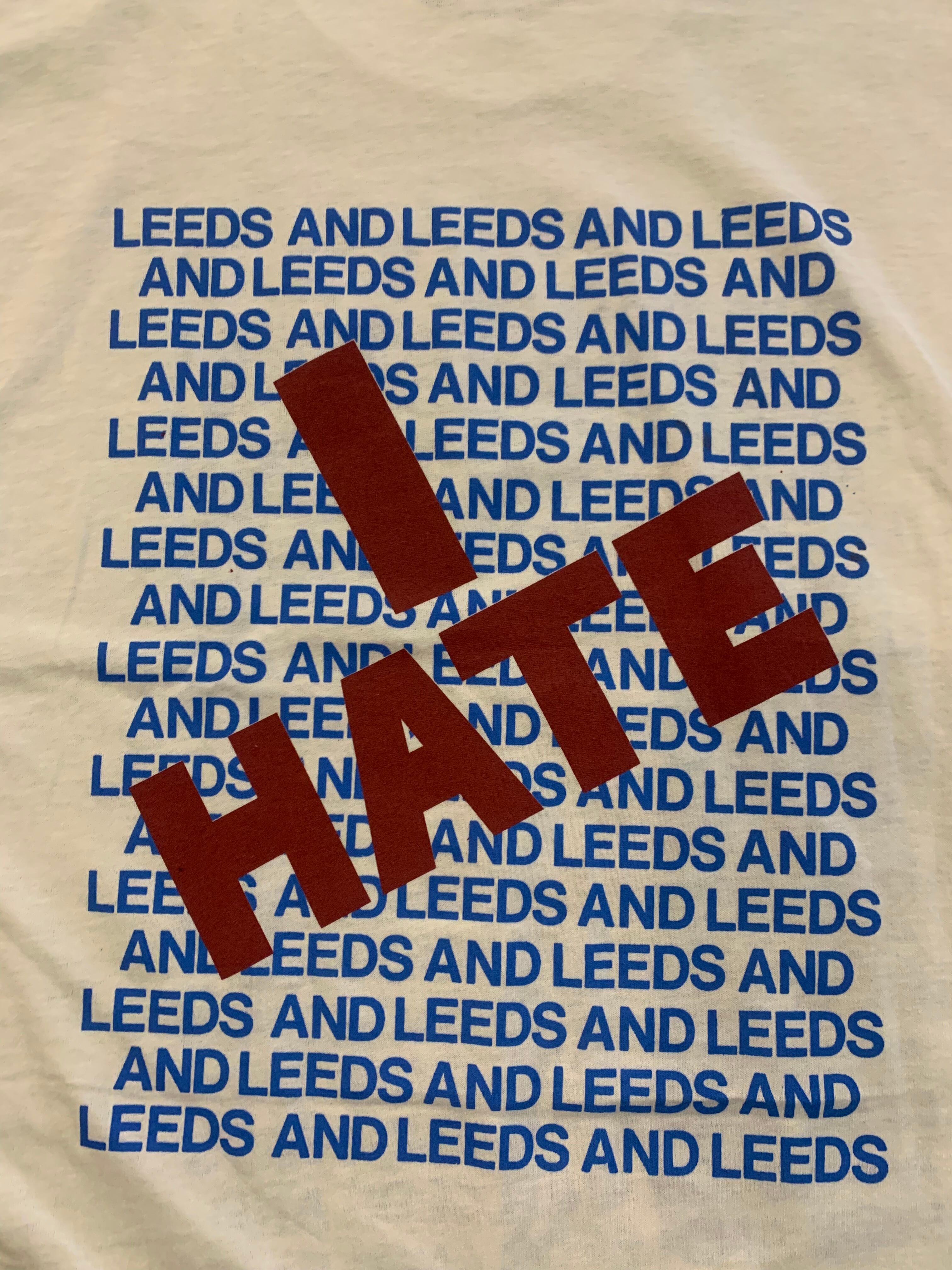 おそらくプリントのカラーから推測できるのが、ウエストハム、アストンヴィラ、バーンリーあたりのFCチームのファンが制作したものではないかと思います。一見シンプルなデザインですが、LEEDSへの強烈なメッセージの込められたTシャツですね。